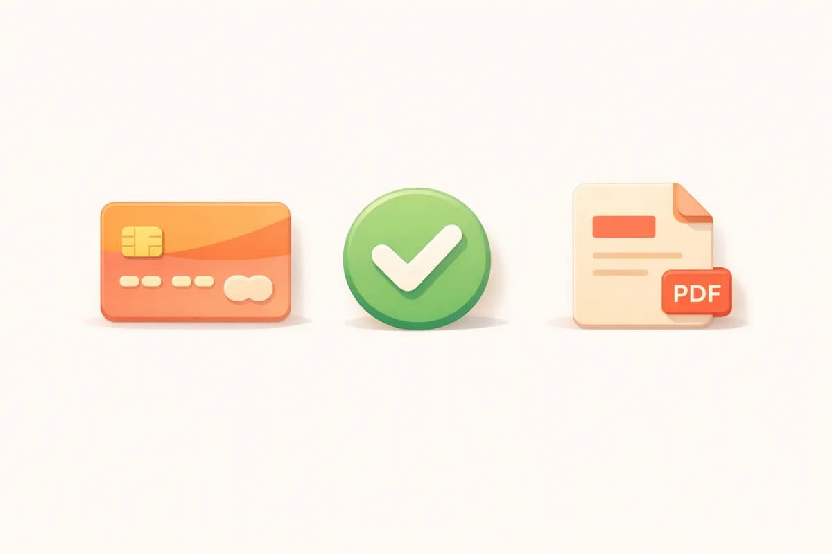 Online-Zahlung (Stripe) + PDF-Rechnung per E‑Mail.